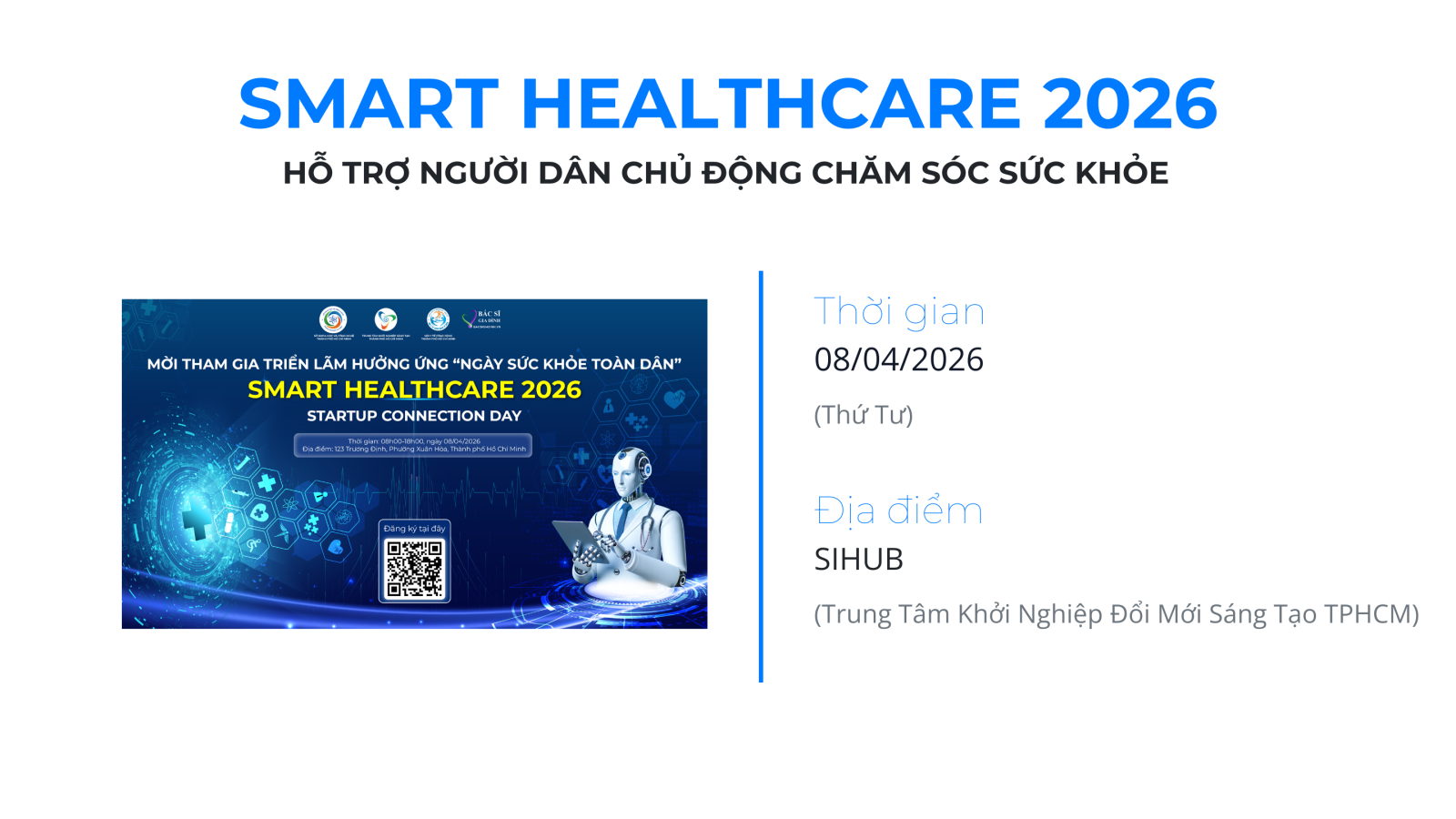 Hưởng ứng Ngày Sức khỏe Toàn dân theo Nghị định 72 của Chính phủ, sự kiện SMART HEALTHCARE 2026 – Startup Connection Day được tổ chức nhằm lan tỏa tinh thần chủ động chăm sóc sức khỏe, đồng thời kết nối hệ sinh thái y tế – công nghệ – khởi nghiệp tại Việt Nam.